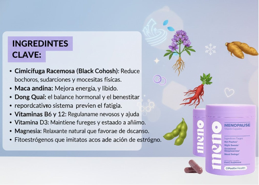 MENO contiene una potente combinación de extractos herbales y micronutrientes:Cimicífuga Racemosa y Maca Andina: El dúo principal para combatir los sofocos y aumentar la energía y la libido.Dong Quai e Isoflavonas (Soya/Trébol Rojo): Actúan como fitoestrógenos naturales, ayudando a apoyar el balance hormonal femenino.Magnesio y Vitaminas B6/B12: Enfocados en la relajación (Magnesio para el descanso) y en la reducción del cansancio y la fatiga (Vitaminas B).Vitamina D3: Esencial para la salud ósea, cuya densidad puede disminuir durante la menopausia.