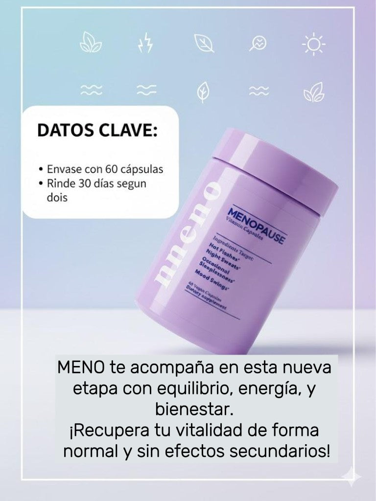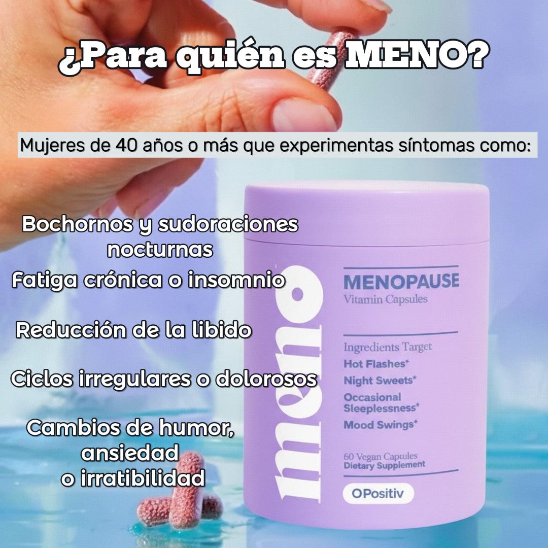 MENO es un suplemento dietético formulado para ofrecer un alivio integral y natural de los síntomas asociados a la menopausia y perimenopausia